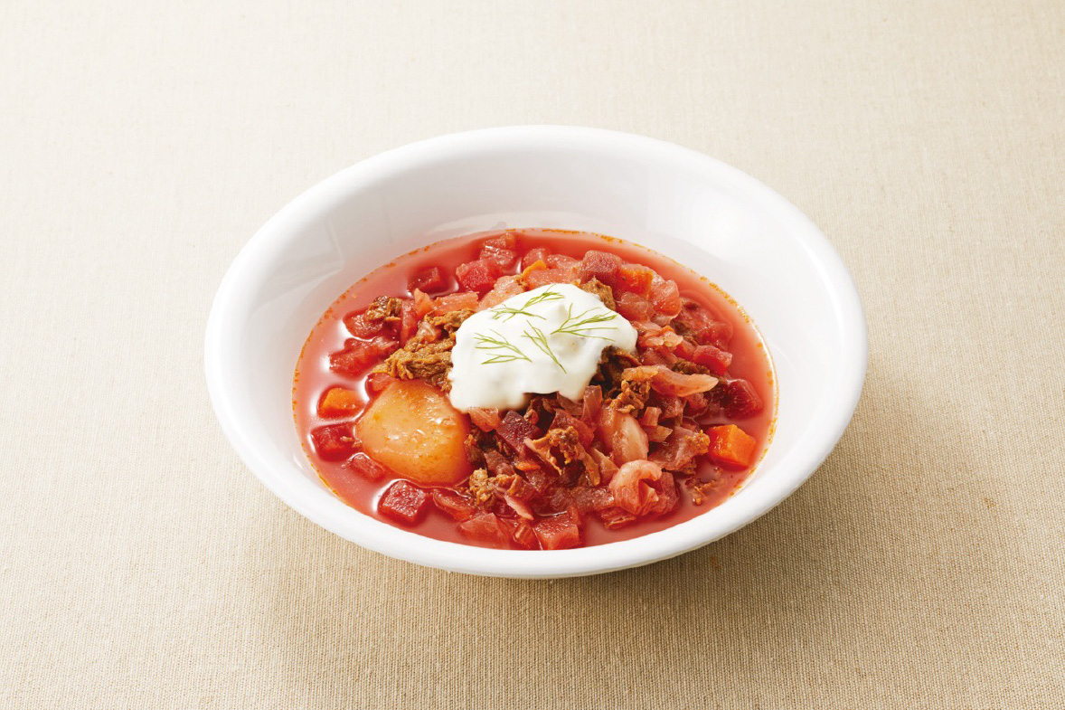 鮮やかな深紅色のスープにサワークリームを添えたメニューです!